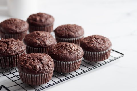 Истурете ја смесата во модли или калапи за мафини, посипете со чоколадни трошки и печете на 180 степени 15-20 минути.