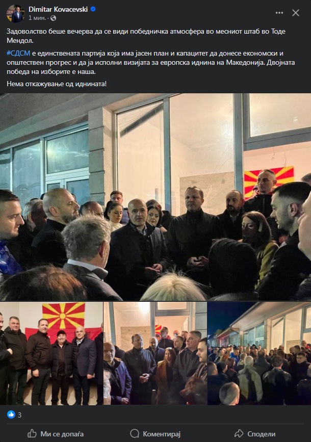 – Задоволство беше вечерва да се види победничка атмосфера во месниот штаб во Тоде Мендол. СДСМ е единствената партија која има јасен план и капацитет да донесе економски и општествен прогрес и да ја исполни визијата за европска иднина на Македонија. Двојната победа на изборите е наша. Нема откажување од иднината!- објави тој на својот официјален профил на Фејсбук.