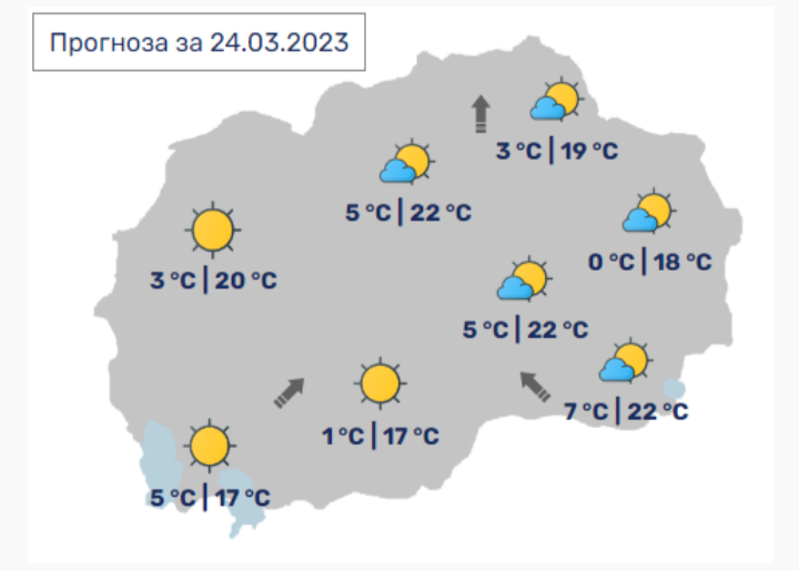 Од УХМР јавуваат дека времето денеска ќе биде претежно сончево со мала локална облачност и со слаб до умерен ветер од југозападен правец. Наутро во долниот тек на Повардарието ќе има појава на ниска облачност.