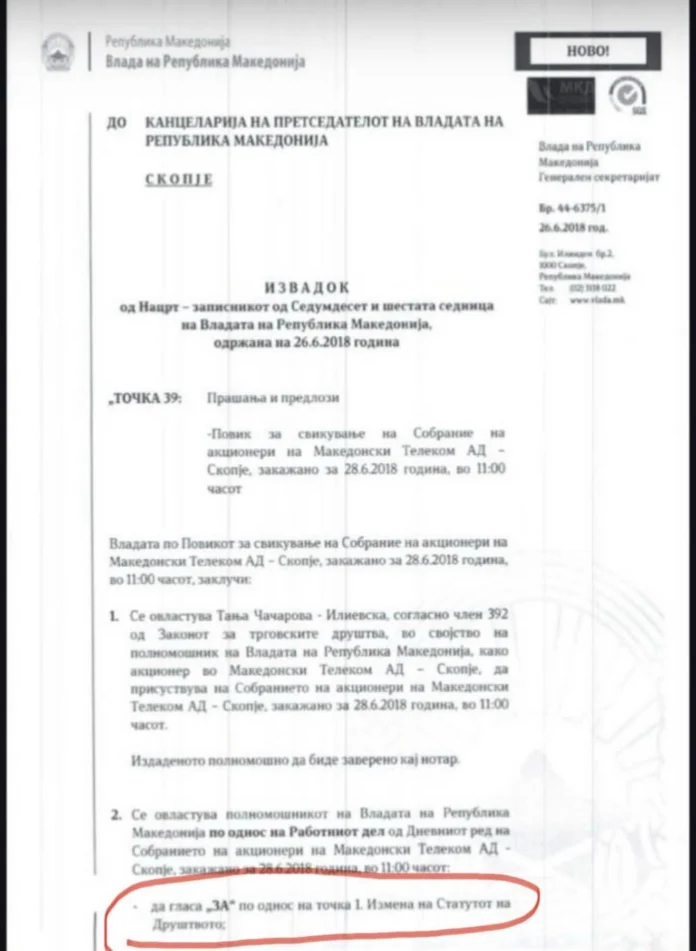 Нашите извори брифираат дека во јуни 2018 година со одлука на тогашната влада било дозволено да се смени статутот на Македонски Телеком и со тоа бил отстранет единствениот механизам кој македонската влада го имала за контрола во компанијата.