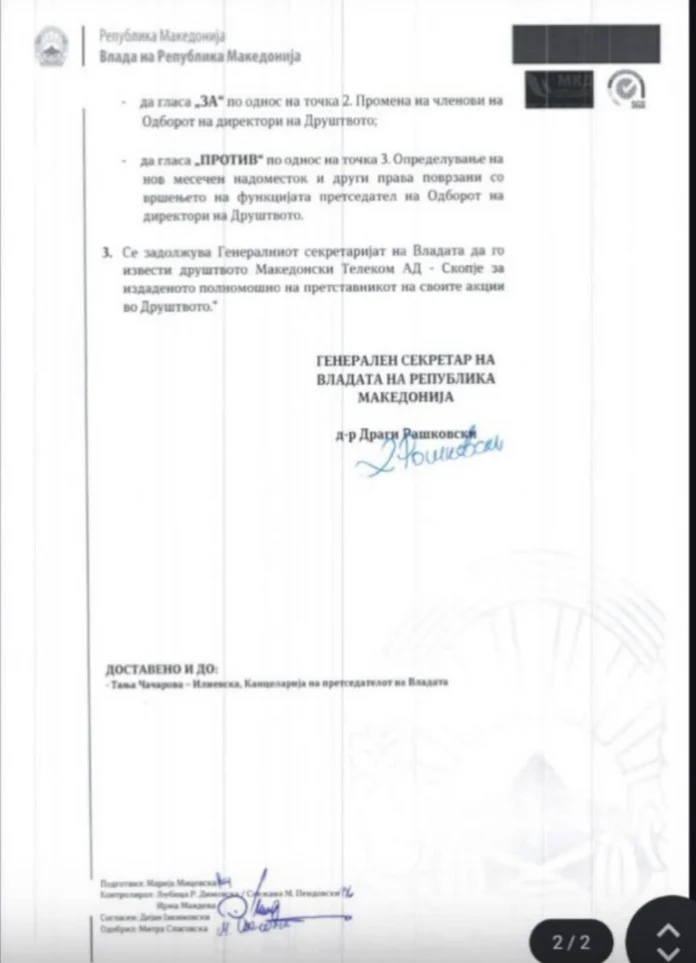 „Со измената на статутот, која беше направена со амин на македонската влада во јуни 2018 година, беше избришана позицијата Оперативен директор, место кое се пополнуваше по предлаг на македонската Влада. Оваа функција имаше врзан потпис со генералниот директор. До тогаш ништо во Македонски Телеком не можеше да помине без согласност на Владата. Од тогаш, пак, никој не ја прашува Владата за ништо“, брифираат изворите на Нетпрес.